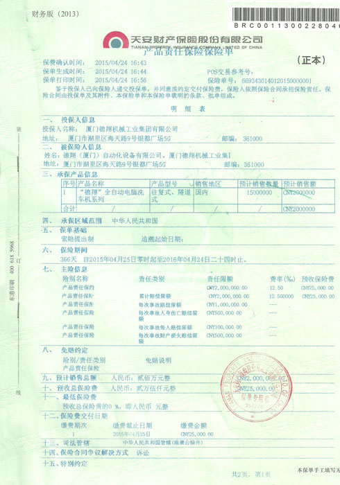 裝備承制單位注冊證書-天安保險單